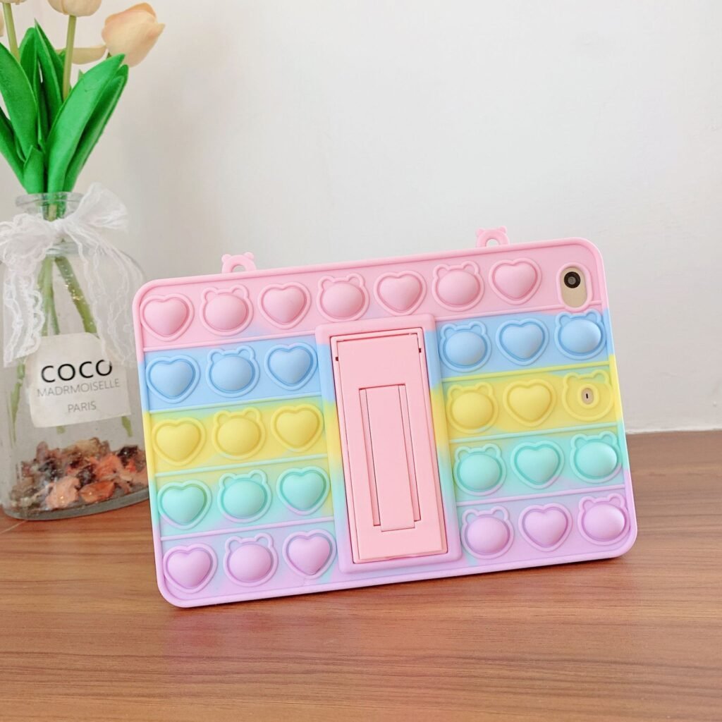 The XINSANJIN Cartoon Bubble Rotating Handle Stand Silicone Case changes everything. Designed for a wide range of iPad models (including iPad Pro 10.5”, 10.2”, iPad Air 3, iPad 2/3/4, iPad Mini series, and more), this case combines 360° rotating hand strap, built‑in stand, bubble‑textured cartoon design, and drop‑proof silicone into one delightful package. It is available in adorable color combinations like Heart+Rope, Purple Heart+Rope, Rainbow Heart, Purple Heart, Rope, and Ball – each adding a playful touch to your tablet.